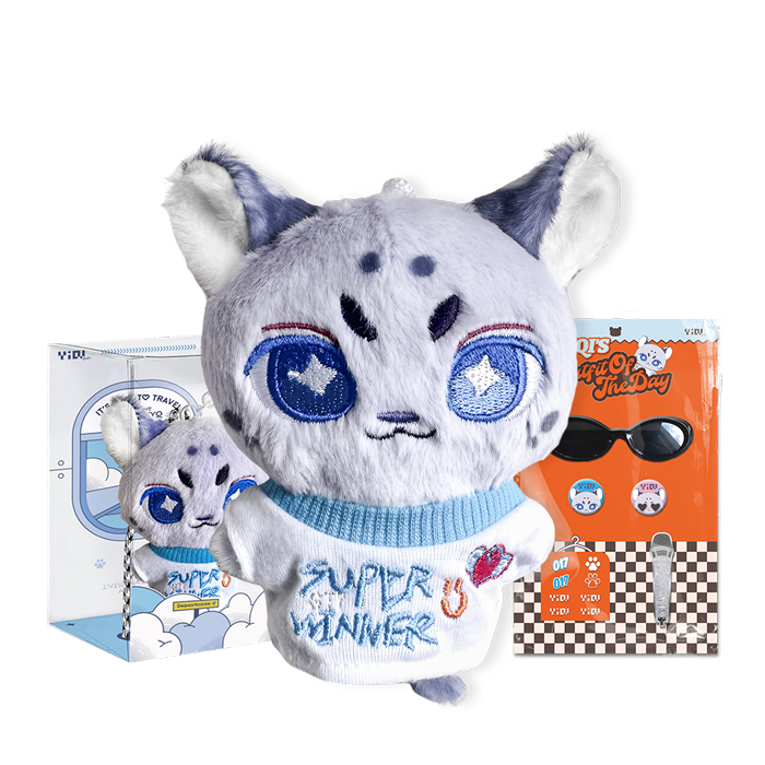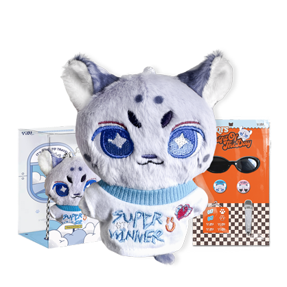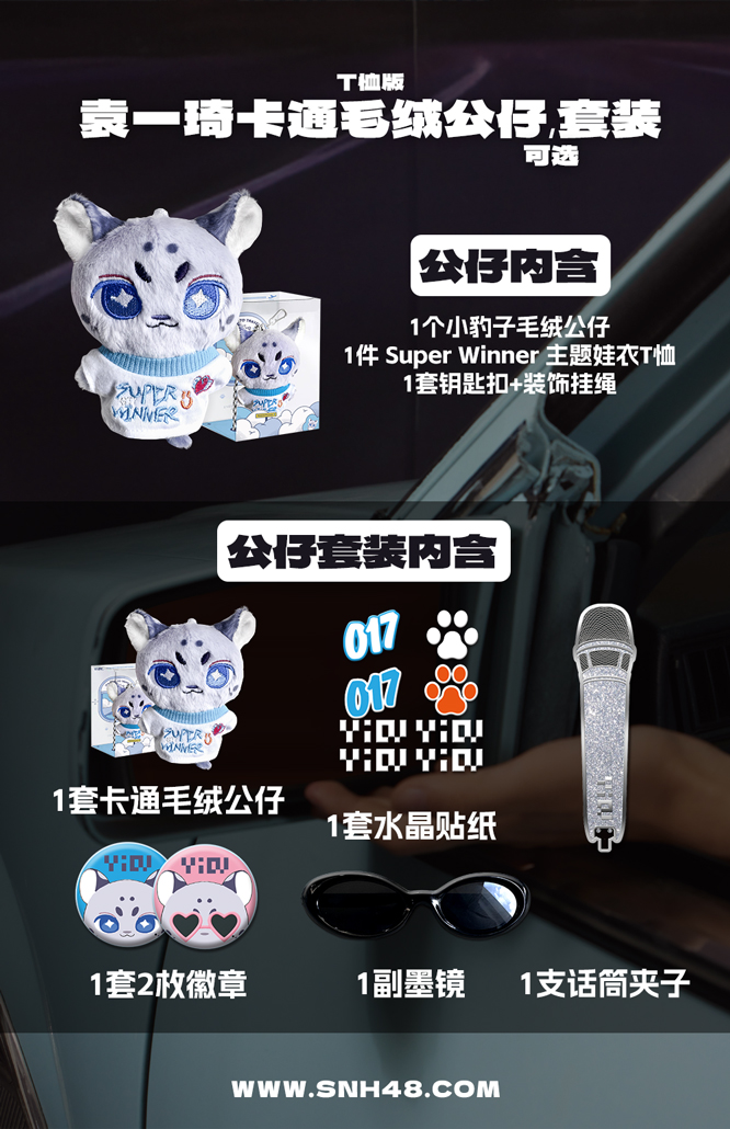 套装款含:1个 小豹子毛绒公仔,1件 《Super Winner》主题娃衣T恤,1组 钥匙扣+装饰挂绳 + 1个 话筒配件 + 1副 墨镜配件 + 2个 迷你徽章 + 1套 主题贴纸;
