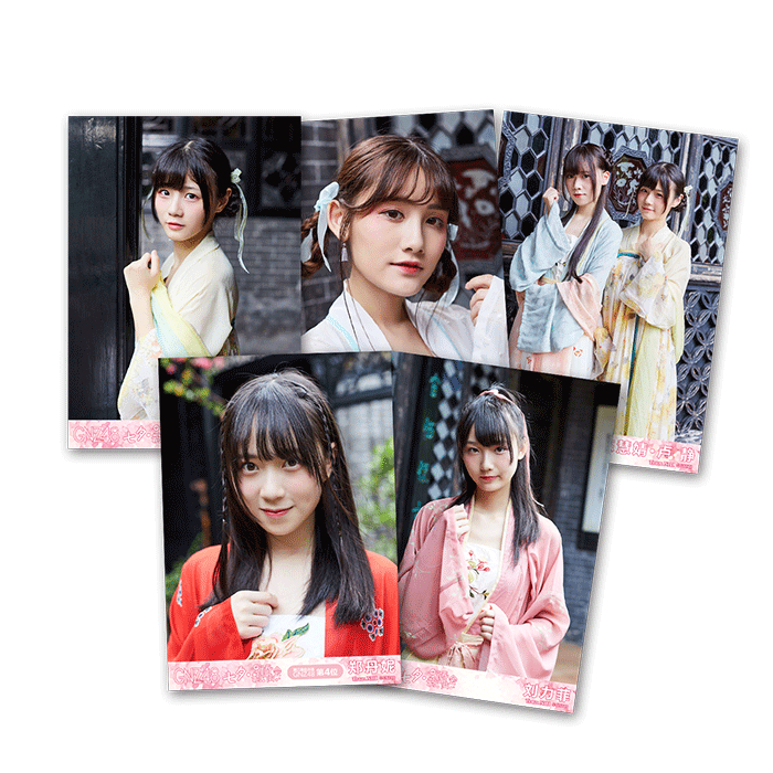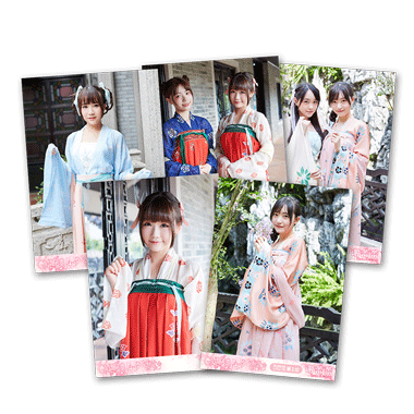 本次生写为1set4张,分别为大头照一张、半身照一张、全身照两张,以及合影照组成,一包5张,每四包必出一包合影,合影随机。