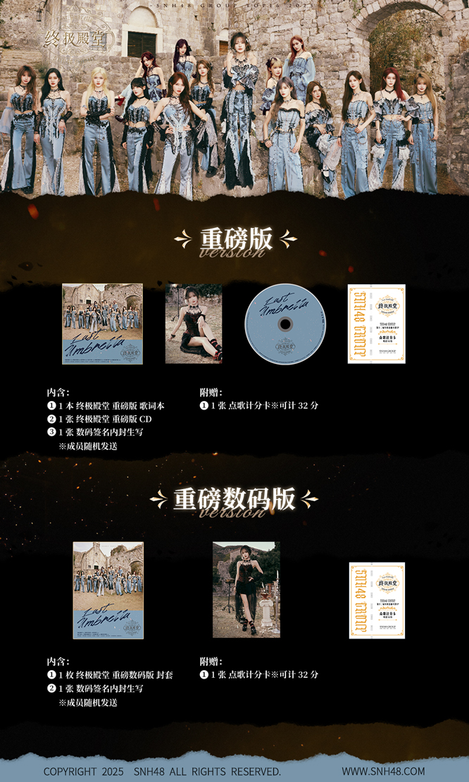 重磅版涵盖内容为:《终极殿堂》重磅版CD 1张、歌词本 1本、数码签名内封生写 1张、免费附赠 1张 点歌计分卡(可计 32分);