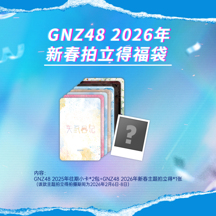 内含:GNZ48 2025年往期小卡*2包+GNZ48 2026年新春主题拍立得*1张(该款主题拍立得拍摄期间为2026年2月6日-8日)
