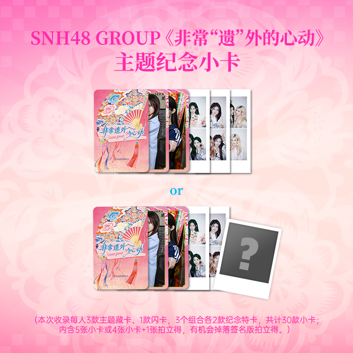 本次收录每人3款主题藏卡、1款闪卡,3个组合各2款纪念特卡,共计30款小卡;内含5张小卡或4张小卡+1张拍立得,有机会掉落签名版拍立得。